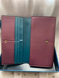 All’interno troviamo un elegante azzurro petrolio organizzato con due ampie tasche e sei porta carte