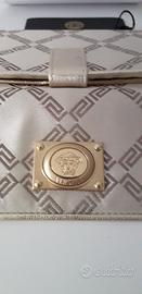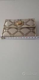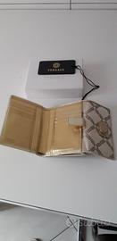 Portafoglio donna Versace. Esterno in tess. Jacquard con la famosa greca "Meandre" rifinito con bordino di pelle dorata. Al centro dell'apertura principale vi è una placca in metallo dorato con l'effige del logo della Maison Versace (La testa di Medusa), al di sotto della quale si può leggere la scritta Versace. Interno tutto in pelle dorata, con impresso la scritta " Versace Made in Italy " È stato realizzato dalla apprezzata e tradizionale pelletteria Italiana, come descritto sulla garanzia in dotazione. Nuovo con garanzia e scatola originale.