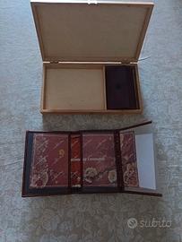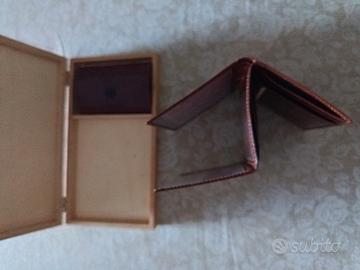 Portafoglio più portachiavi in PELLE di ottima e prestigiosa artigianalità , racchiuse in un esclusivo cofanetto in legno e pelle , nuovi e mai usati così come si vede da foto .