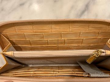 Vendo portafoglio marca Genny, lavorazione coccodrillo, con zip, misure 20x12 cm, colore giallo/pesca chiaro. Made in Italy. Scomparto per moneta con zip, scomparti per carte di credito. Ancora con protezione di plastica nelle cerniere. Scatola originale (con macchia sul davanti). Mai usato. Vendo per inutilizzo.