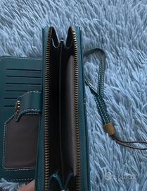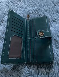 Portafoglio grande lunghezza cm 19 , larghezza 10 cm , spessore 3cm , con scomparti per carte , monete e banconote + braccialetto per portare al polso .