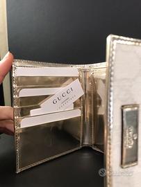 Portafoglio Gucci tri-fold in tela bionca con monogramma GG e finiture argentate