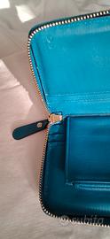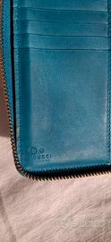 Portafoglio firmato Gucci in pelle azzurro, con iconico motivo GG impresso.