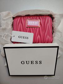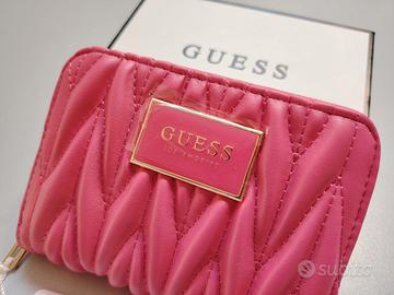 Misure 14x9x3 cm. Colore: fucsia. Scomparto principale con tasca portamonete interna con cerniera lampo. Slots per carte di credito. Esterno in simil pelle trapuntata. Chiusura con cerniera lampo. Metalleria color oro. Rettangolo frontale con logo in metallo. NUOVO con cartellino, mai usato. Completo di scatola e pellicole protettive originali.