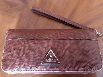 Portafoglio Guess con esterno in ecopelle color marrone.Dimensioni: larghezza 18 cm, altezza 11 cm, profondità 2,5 cm. Slots per carte di credito e documenti.Metalleria colori oro pallido. Portamonete interno . Scrittura logo in metallo frontale. Polsiera removibile. Usato presenta segni di usura come da foto. Interno come nuovo.
