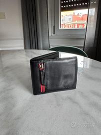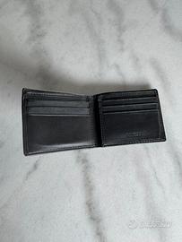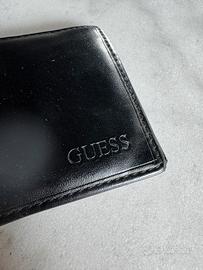 Portafoglio Guess in pelle nera. All’interno presenta uno scomparto per i contanti, 6 scomparti per le carte di credito e due tasche. Sul davanti ha una tasca con cerniera per le monete. Misure chiuso circa 10,7 x 8,9 x 2,5 cm