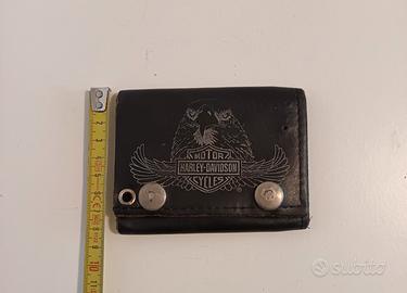 Portafoglio Harley Davidson in pelle con piega a triplo, chiusura a doppio scatto. Anello per catena. Usato presenta alcune macchie interne.