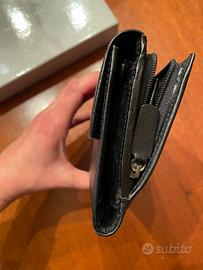 Portafoglio in pelle nera Nannini, interno in tela fucsia, da un lato scompartimento tessere e tasche di cui una con zip, dall’altro apertura con zip per monete e banconote. Usato ma in buone condizioni.