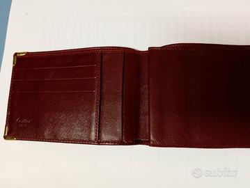 Elegante portafoglio Le Must de Cartier da uomo, realizzato in pelle di vitello bordeaux con angoli dorati.