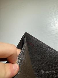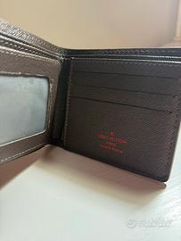 Portafoglio Louis Vuitton originale in canvas Damier Ebene, con stampa a scacchi marrone e logo “Louis Vuitton Paris” visibile.