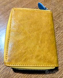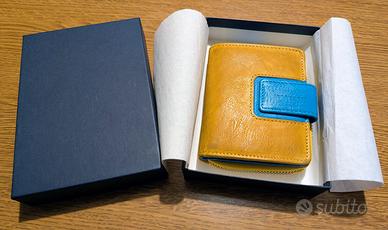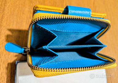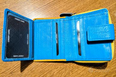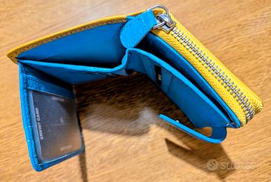 Vendo portafoglio Mancinelli in vera pelle di colore ocra e turchese. Il portafoglio è nuovo, mi era stato regalato e non è mai stato utilizzato, conservato sempre nella sua confezione originale. Caratteristiche: Portafoglio in vera pelle multicolor ocra e turchese, è dotato di chiusura a bottone a scatto, 11 slot per carte di credito, 1 vano per documenti traslucido, 1 ampio vano per banconote ed il portamonete esterno con chiusura a zip. Dimensioni da chiuso: 12 x 9 x 3 cm