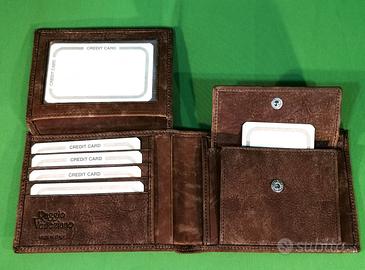 Portafoglio unisex in vera pelle di vacchetta a concia vegetale colore tabacco cucito a mano nel cuore di Venezia, marca Raggio Veneziano. Chiusura a libro con taschine per 7 carte + 3 nei lati in orizzontale e una patella con retina per documento identità, patente, ecc.
