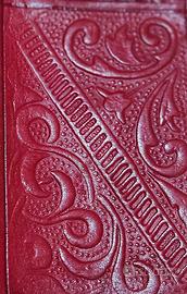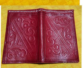 portafoglio artigianale in pelle rossa, spesso descritto come stile vintage o marocchino. Presenta disegni decorativi floreali o astratti stampati in rilievo o incisi a mano sulla superficie.