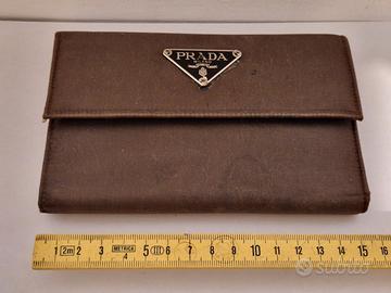 Portafoglio Prada in tessuto nylon marrone con l'iconico logo triangolare in metallo. Imitazione