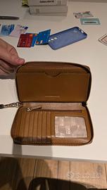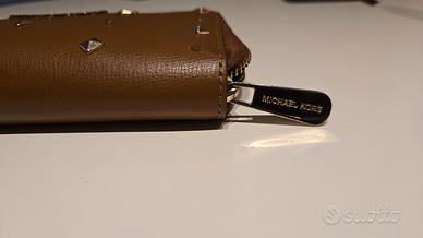 Vendo nuovo portafoglio da donna Michael Kors, color cammello, con borchie dorate e dettagli dorati, mai utilizzato, molto spazioso e pratico, con gancio, da portare anche come pochette.