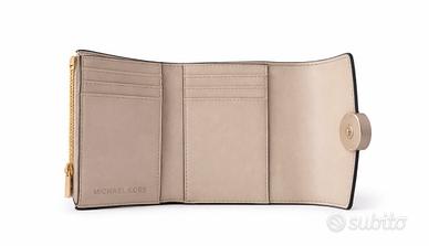Il portafoglio nell'immagine è il modello Carmen Medium di Michael Kors, realizzato in pelle di Saffiano, con chiusura a busta e logo dorato. Non è mai stato utilizzato, perciò si trova in perfette condizioni. L’interno è pulito e ben tenuto, comprende gli scomparti per carte + tasca con zip e infine anche la chiusura con bottone Spedizione veloce Scrivimi per info o offerte