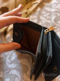 portafoglio in pelle nera desing compatto e funzionante dettagli con zip a cuore dorata