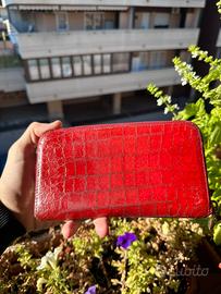 Il portafoglio Miu Miu in rosso rubino presenta un design elegante e sofisticato. Le sue dimensioni sono di 10 cm di lunghezza e 20 cm di larghezza, rendendolo compatto ma spazioso. La superficie esterna ha una finitura in pelle con un motivo che imita il cocco, conferendo un aspetto lussuoso.