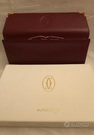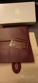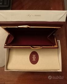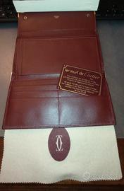 Portafoglio originale "Must de Cartier" in pelle bordeaux, con angoli dorati e logo inciso.