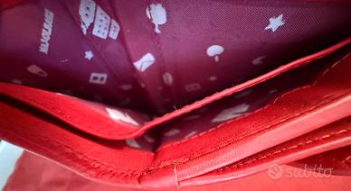 Portafoglio Naj-Oleari usato in pelle rossa. Chiusura con doppio bottone a pressione. Il primo bottone chiude il portamonete e una piccola tasca con cerniera. il secondo bottone chiude il portafogli con due comodi scomparti e numerosi porta carte. presenta segni di usura come mostrato dalle foto. c’è una piccola macchia visibile nella prima foto in basso a destra.