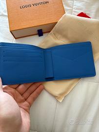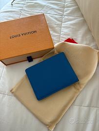 Vendo Louis Vuitton Slender Wallet in pelle Taurillon originale di altissima qualità, colore blu intenso. Questo portafoglio è assolutamente nuovo, mai utilizzato nemmeno una volta. Conserva ancora il tipico odore di pelle nuova della maison. È perfetto, senza alcun segno d’uso, graffio o piega. Caratteristiche: • Pelle Taurillon cowhide full-grain con logo LV monogram embossato (in rilievo) sul fronte • Design slim e compatto (bifold orizzontale), ideale per stare in tasca senza ingombro • Interno in pelle con scomparti per carte di credito e banconote • Include il dust bag originale beige Louis Vuitton (visibile nelle foto)