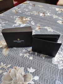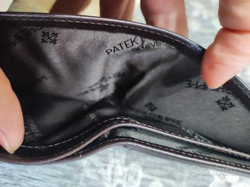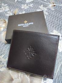 Portafoglio da uomo Patek Philippe in pelle color testa di moro con impunture a contrasto. Completo di scatola logata.