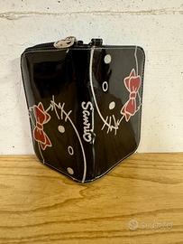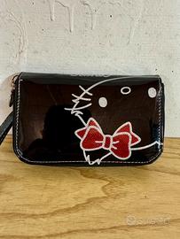 Portafoglio originale Sanrio in ecopelle nera lucida con Hello Kitty e fiocco rosso glitterato. Include cinturino da polso removibile. Interno con scomparti per carte, tasca per banconote e finestra trasparente. Chiusura a zip esterna e bottone a pressione interno. Ottime condizioni, grafiche e struttura intatte.
