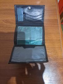 Portafoglio donna in pelle, color nero, con impunture marroni. Dalla foto si vede che ha porta documenti in più parti. Usato poche volte, come se fosse nuovo.