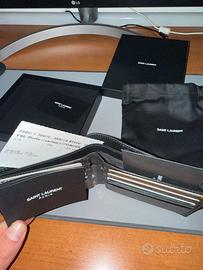 Vendo portafoglio originale Saint Laurent Rider in pelle nera, con logo YSL in rilievo, acquistato recentemente e in perfetto stato.
