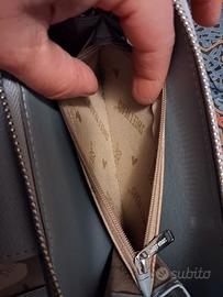 portafoglio donna Sweet Years, colore celeste pastello, apertura con clip a pressione, diversi taschini per le tessere, 1 scomparto per le banconote, portamonete con zip e con divisorio interno e due scomparti. ottime condizioni a parte segni di usura vicino al bottoncino (vedi foto). Misure cm 20x11x3,5.