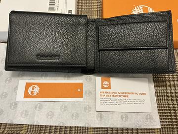 Portafoglio Timberland in vera pelle martellata colore nero, nuovo con cartellino, mai utilizzato, completo di confezione originale.