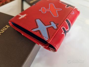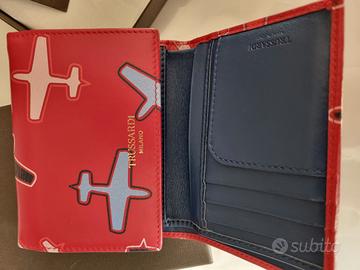 Color rosso con aereoplanini rosa chiaro, azzurri e neri; le tasche interne sono finemente rivestite dal tessuto con la scritta e il levriero di Trussardi.