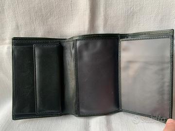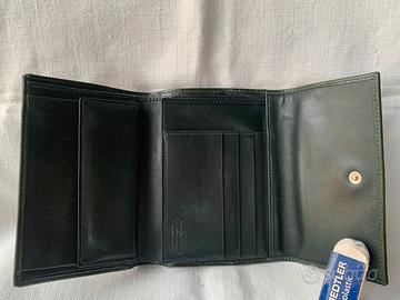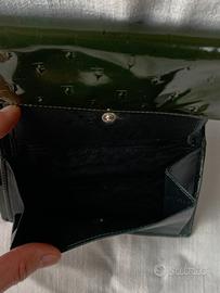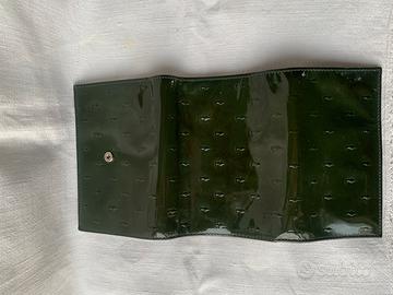 Portafoglio Trussardi originale vintage (fine anni ’90 / primi 2000) in vera pelle verniciata verde, con iconico logo Trussardi in rilievo.