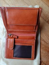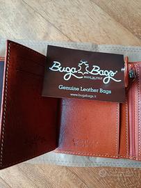 Portafoglio uomo di pelle, marca BUGABAGS, di dimensioni contenute ed adatto a portatessere, banconote e comodo portamonete. Colore cuoio, NUOVO nella sua scatola originale.