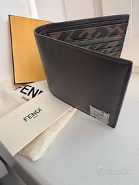 Portafoglio con interno organizzato in 8 slot portatessera e due scomparti per banconote. Realizzato in pelle nera e rifinito con dettaglio in tessuto FF nei toni del marrone