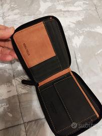 Portafoglio da uomo. La chiusura è con zip. Le tasche interne sono portacarte e portamonete. Le tasche esterne sono assenti. La tracolla è assente. Il manico è catena. Gli scomparti interni sono uno. Il materiale esterno è 100% Vera Pelle. Internamente è foderato in vera pelle. Misure: 10x12x3 cm .
