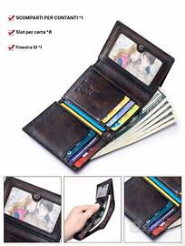 ✨ Portafoglio uomo premium in pelle effetto vintage Design elegante con incisione leone 🦁 – simbolo di forza e stile. 🔒 Protezione RFID integrata Protegge le tue carte da clonazioni e furti digitali. 💼 Capiente ma compatto • 8 slot carte • 1 scomparto contanti • 1 finestra ID • Design sottile, perfetto da tasca 📏 Dimensioni: compatto (entra ovunque, no mattoncino) 🔥 Ideale per: • uso quotidiano • regalo elegante • outfit classy o street 📦 Condizione: Nuovo 💯 Qualità top, materiali resistenti ⚡ Spedizione veloce