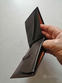 Portafoglio uomo modello classico in vera pelle di vitello stampato ad effetto coccodrillo. Articolo nuovo di campionario. Dotato di una grande tasca interna per banconote, 2 tasche laterali per carte o tessere, 1 tasca laterale con chiusura per monete o altro e altre 2 aperture interne nascoste per contenere carte o tessere. Colore mogano, marrone tendente al rossiccio.