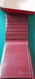 Portafoglio/portamonete/portacarte di credito in pelle di vitello bordeaux. Esterno: logo doppia C di Cartier in rilievo, angoli in metallo finitura oro.