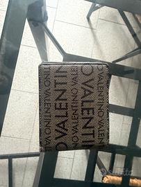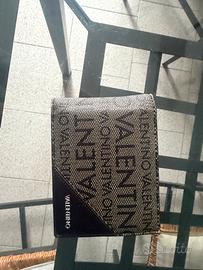Elegante portafoglio Valentino in tela logata con stampa all-over e inserto in pelle nera con logo frontale. Design moderno e raffinato, perfetto per chi ama uno stile distintivo ma sofisticato.