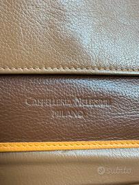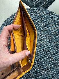 Vera pelle. Esterno giallo senape; interno ocra, beige e marrone. Capientissimo, molti scomparti per banconote, carte e documenti. Portamonete con chiusura a zip. Misure 10 x 15 x 3 cm. Condizioni ottime, esterno anteriore e interno perfetti, lievi segni di usura agli angoli del retro. Disponibile per spedizione o ritito a mano a Milano.