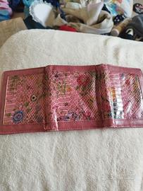 Portafoglio rosa con fiori pieghevole Alcune parti sono rovinate Ci sono 8 tasche per la carte, una per le banconote e una per le monete Lunghezza: 11 cm Lunghezza aperto: 27 cm Larghezza: 9 cm