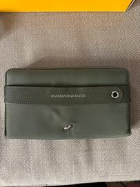 Portafoglio vintage zip around in mitrix, storico materiale del marchio Mandarina Duck caratterizzato da resistenza, versatilità ed effetto cangiante. Color cachi. Presenta numerosi vani per carte di credito e uno portamonete zippato. Nuovo completo di sacchetto salva polvere e scatola. Misure cm 19 x 10