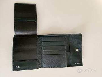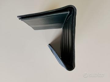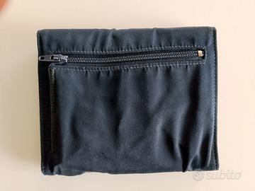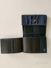 Portafoglio vintage PRADA di tessuto vela blu esterno e pelle blu interno. Sul davanti presenta l'iconico logo triangolare Prada. All’interno la scritta stampata Prada Milano e il Logo Made in Italy. È un accessorio che chiuso misura 13 cm di larghezza e 11 cm di altezza. Mentre aperto misura 28 cm di lunghezza. E’ composto di 2 tasche porta fogli, 5 porta tessere, 1 porta libretto assegni e un grande porta/cartamoneta. Sulla parte retrostante con portafoglio chiuso vi è il portamonete chiuso da cerniera.