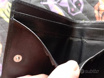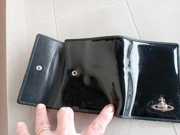 Portafoglio da donna nero in vernice e vera pelle, originale Vivienne Westwood, prodotto negli anni 80, con taschina portamonete esterno, usato ma in ottime condizioni, segni di usura nel bordo della fodera interna e leggerissimi piccoli segni evidenziati nelle foto.