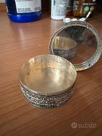 Portagioie argento lavorato a mano , inserto turchese , inserto centrale giada , con specchietto su coperchio interno anni 50