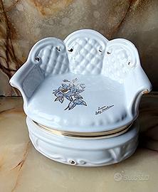 In vendita: scatola in ceramica italiana vintage di Italceramica ( 12 x 9 x 10 )cm. Italceramica è una rinomata manifattura ceramica italiana, nota per i suoi raffinati design e ricchi. Questa elegante scatola è decorata con un delicato motivo floreale e accenti dorati, che le conferiscono un tocco di raffinatezza. Realizzata in Italia, presenta un marchio Italceramica (Bomboniere) sul fondo, che ne conferma l'autenticità . La data di produzione stimata è metà-fine del XX secolo. La collezione Bomboniere, a cui appartiene questa scatola, è stata progettata per conservare caramelle, gioielli o altri piccoli oggetti, rendendola un'opzione regalo elegante . Perfetta per collezionisti o come raffinato elemento decorativo, può essere utilizzata anche per conservare piccoli oggetti.