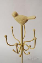 Porta gioielli in ferro smaltato color bianco panna a forma di attaccapanni a sei braccia ed uccellino decorativo.