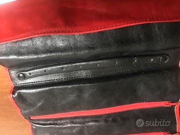 Portagioie vintage rosso in vera pelle morbidissima di capretto del marchio italiano Serrapiani Milano. Con fibbia dorata. Interamente rivestito di pelle anche all’interno, di colore nero. Dotato di 3 scomparti interni con chiusura a cernerniera a tutta larghezza e striscia in pelle nera con fermaglio/chiusura a bottone con buchi dove inserire orecchini. Nuovo. Dimensioni: larghezza 22,5 cm, altezza 8 cm, lunghezza aperto 28,5 cm.