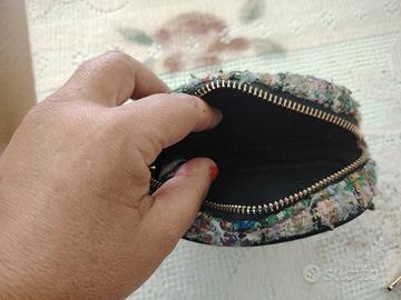 Portamonete in tweed multicolore, ideale nel periodo autunnale - invernale, colori prevalenti il verde ed il nero. Capiente, prezzo interessante.